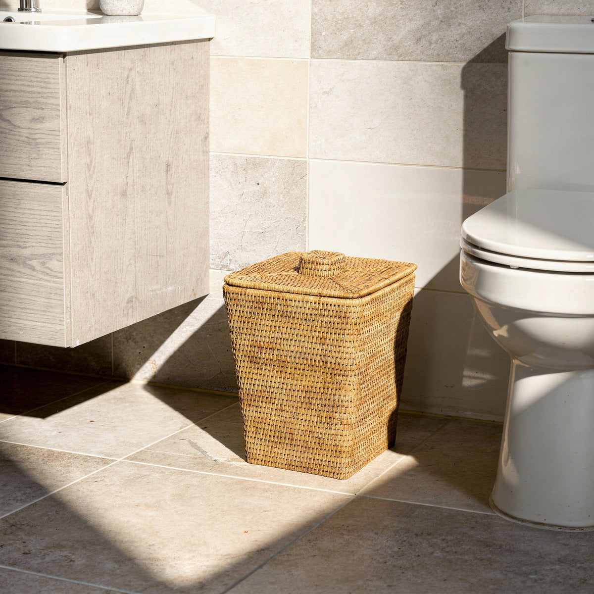 Enhance your space with the La Jolla Rattan Waste Basket with Lid and Plastic Insert. This square rattan waste basket in honey-brown color is handwoven by artisans from naturally and sustainably grown rattan, adding a touch of natural elegance to any room. The lid conceals waste, while the plastic insert ensures easy cleaning and maintenance. Measuring 9 inches by 9 inches and standing 12.5 inches tall, this rattan trash bin is perfect for bathrooms, offices, or any space needing a stylish and eco-friendly trash solution.
