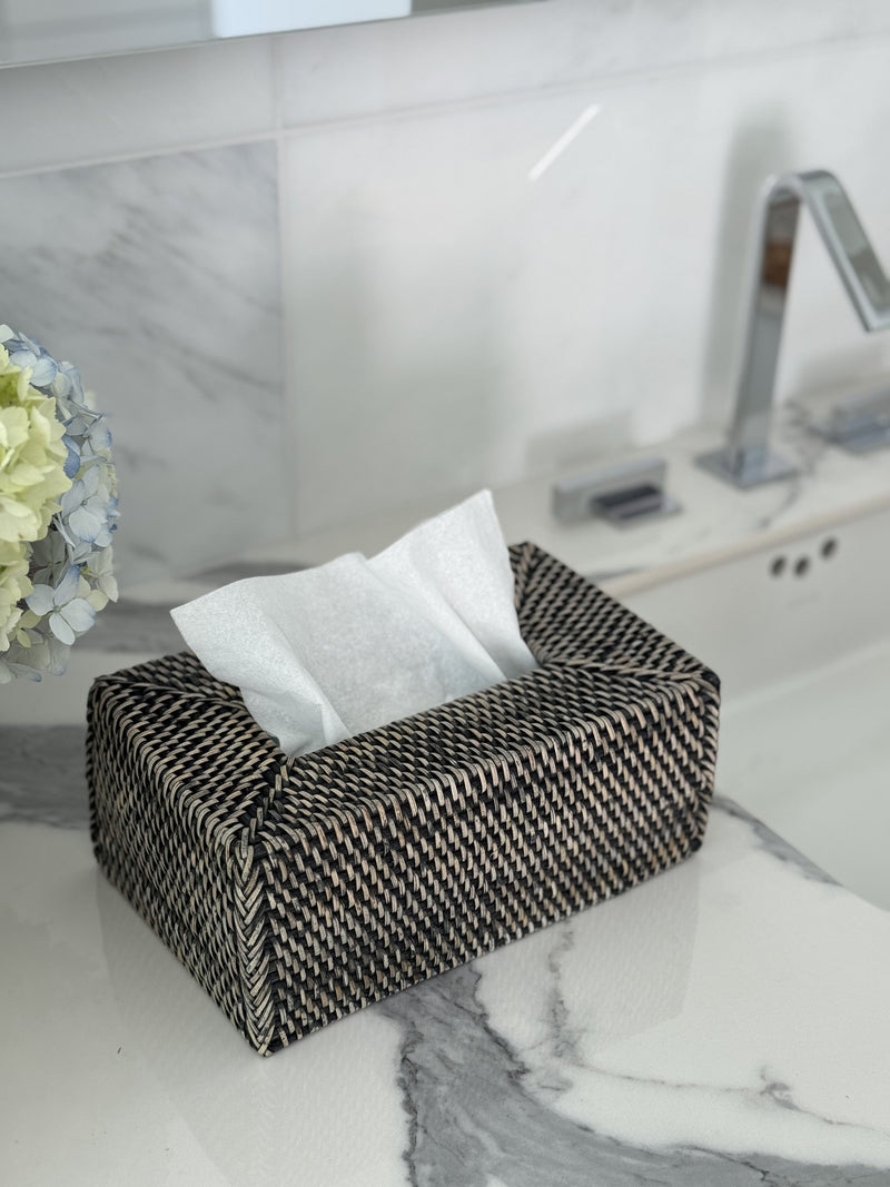 Here's how to turn an everyday item such as a paper tissue box into an elegant accent piece! Our hand-woven rustic rattan tissue box holder can be used for convenience, as well as beachy decoration. This rattan tissue box cover is suitable for standard rectangular-sized tissue boxes. Available in five color finishes – honey-brown, Latte, black-wash, espresso, and solid black.