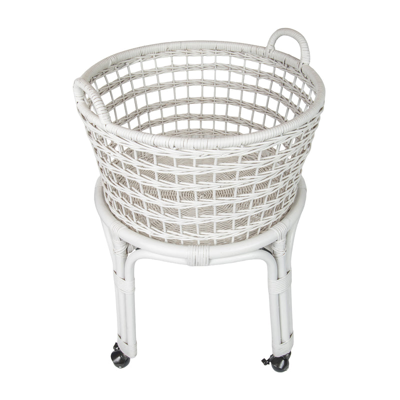 This rolling hamper consists of two parts – a woven basket and a sturdy stand with wheels.