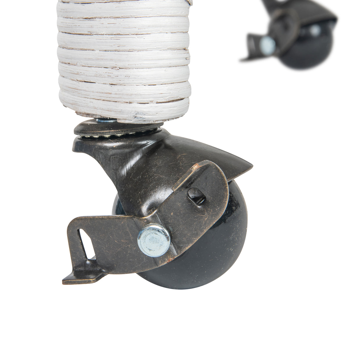 Sturdy stand made from rattan poles, equipped with locking caster wheels for easy mobility.